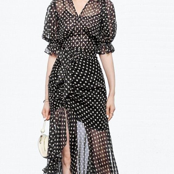 ワンピース ドット ドレス アシンメトリー 膝下 ミモレ ミモレ丈 袖あり パフスリーブ Vネック セミフレア マーメイド シャーリング ティアード プリーツ シフォン スリット かわいい 大人可愛い きれいめ シンプル 大人 上品 おしゃれ お洒落 かっこいい 大人可愛い 大人女子 ラブリー キュート ガーリー 個性的 クール モード系 セクシー エレガント 主役級 存在感 とろみ感 黒 ブラック ドット柄 水玉 春 結婚式 二次会 披露宴 10代 20代 30代 40代 レディース デート パーティー