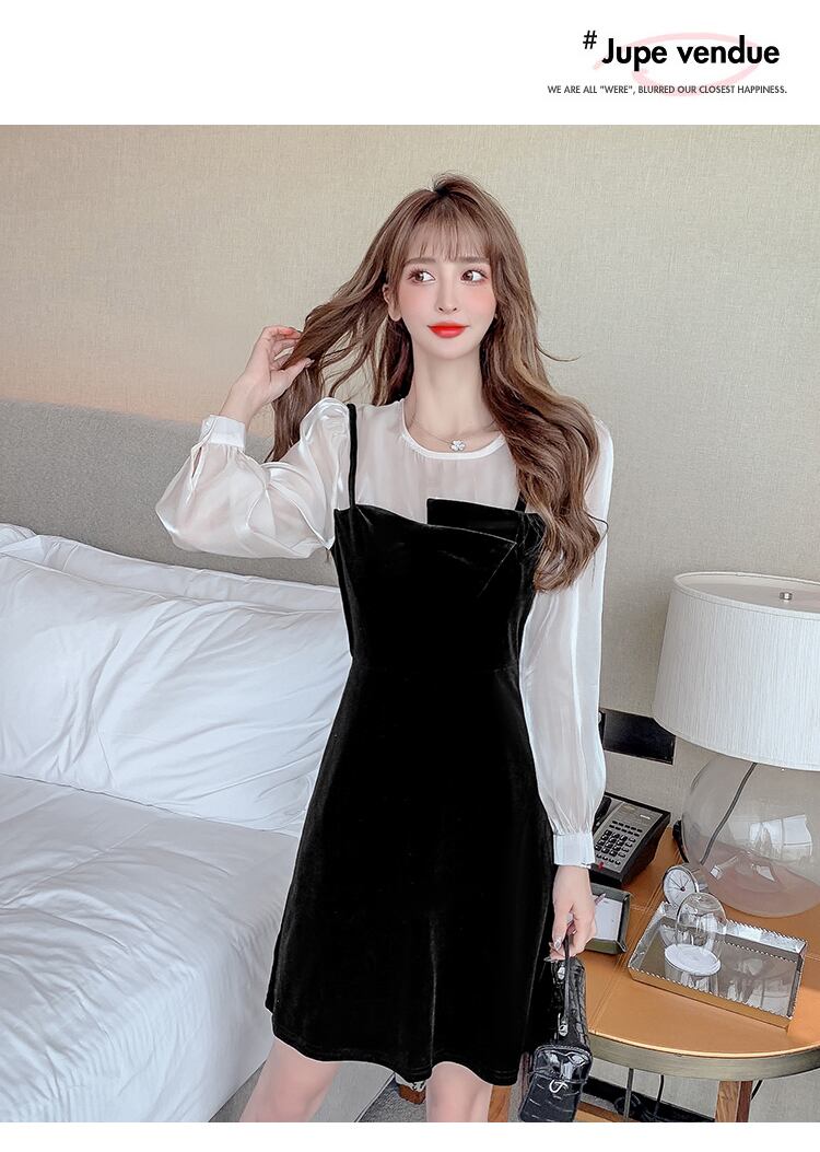 シフォンブラウスとベルベットのキャミワンピをレイヤードしたような一着。