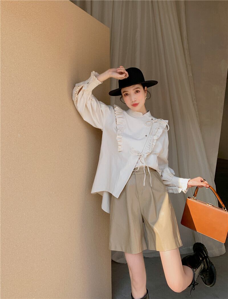 風合いのあるクリーム色生地と袖の後ろのフリルまでニュアンスのある一着。