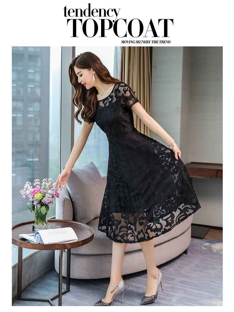 レースをふんだんに使用したエレガントなワンピースです。単色のデザインでアクセサリーが引き立ちます。