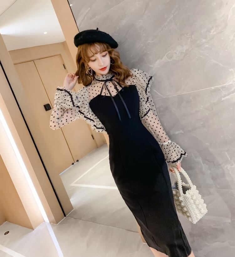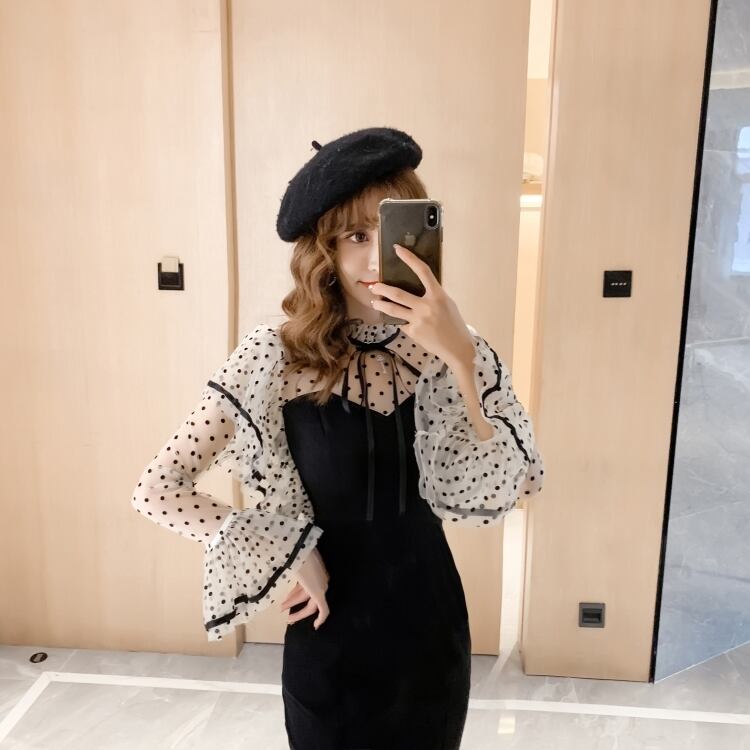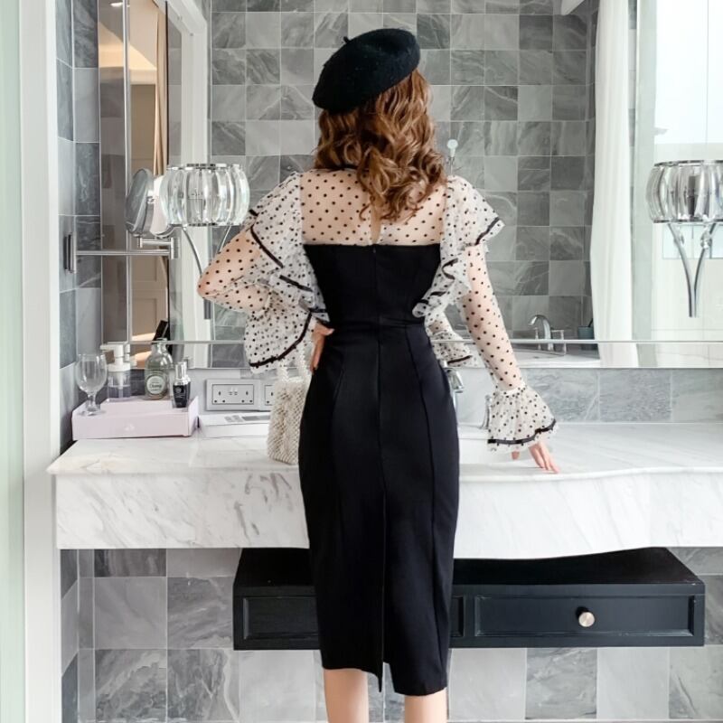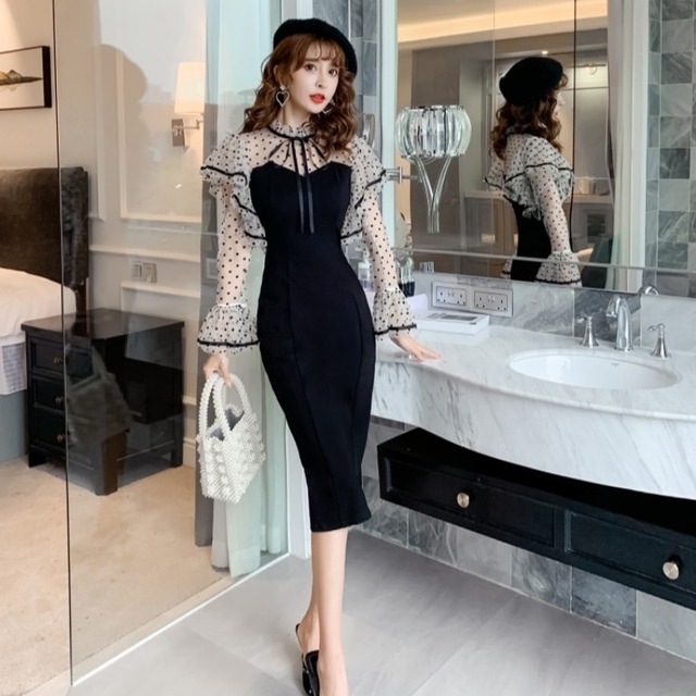 ワンピース レディース 送料無料 ドットチュールワンピース ビスチェ風 タイトワンピース 長袖 ハイウエスト ひざ丈 フレアスリーブ 水玉 ドット リボン おしゃれ ロマンチック ガーリー キュート かわいい こなれ感 スタイル 小顔見せ 着痩せ 体形カバー インスタ トレンド きれいめ エレガント ギャザー シャーリング フレア レース シースルー 透け感 大人かわいい 上品 ブラック 結婚式 お呼ばれ 二次会 パーティー フォーマル イベント ドレス カジュアルドレス