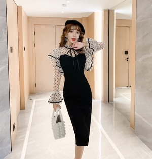 ビスチェ風デザインのタイトスカートと水玉のふわふわチュールの組み合わせがキュートなワンピースです♡〈長袖〉