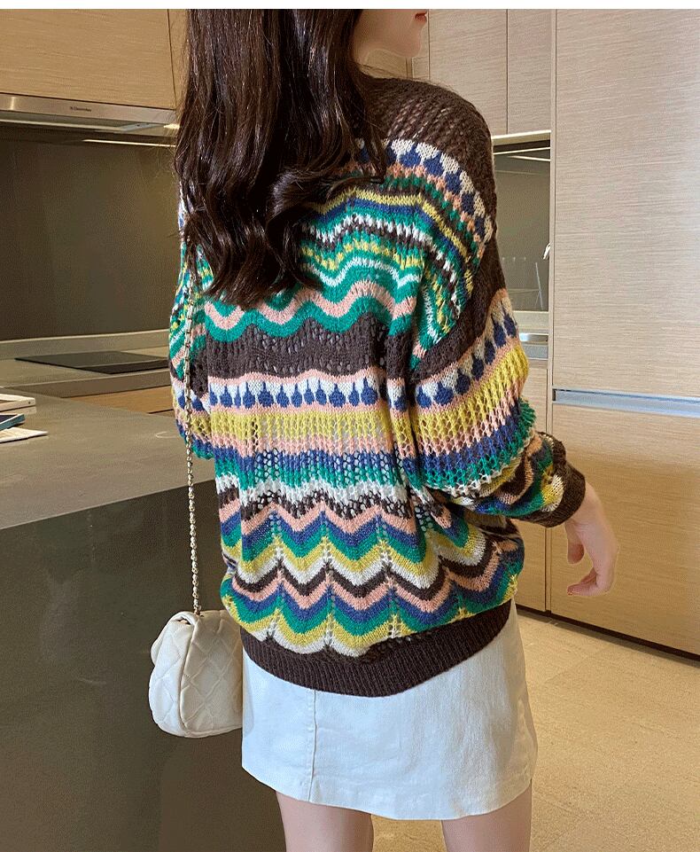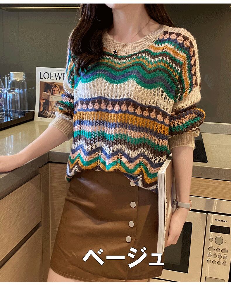 トップス ニット レディース 送料無料 2色 長袖 クルーネック 透かし編み オーバーサイズ ビッグシルエット 透け感 シアー カジュアル ルーズ レインボー カラフル ペールトーン パステルカラー 楽チン 体型カバー 足長 水色 オレンジ ホワイト ブラック 10代 20代 デート 通学 おしゃかわ アクティブ ゆるかわ 送料無料