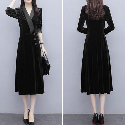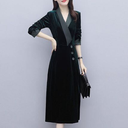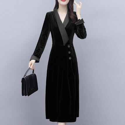 ベルベット風のレトロな生地で仕立てた深い色味が大人っぽい一着。