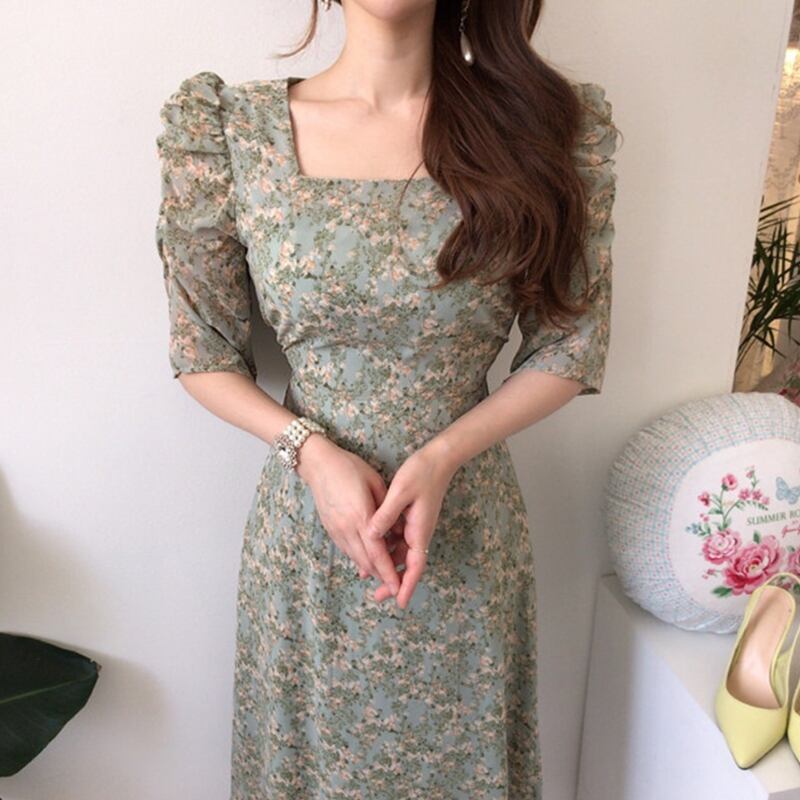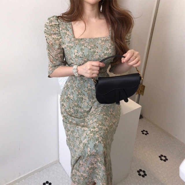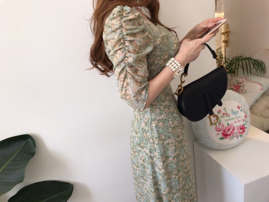 ワンピース レディース 送料無料 2色 フラワープリントワンピース フレアワンピース 半袖 ハイウエスト ミモレ丈 花柄 フラワープリント 小花 フローラル リラックス おしゃれ ロマンチック ガーリー キュート かわいい こなれ感 スタイル 小顔見せ 着痩せ 体形カバー インスタ トレンド グリーン ピンク きれいめ エレガント ギャザー シャーリング フレア 大人かわいい 上品 リゾート 旅行 シフォン ドール お人形 ふんわり パフスリーブ デート お出かけ カジュアルドレス