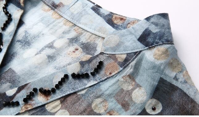 襟もとにはビーズをあしらったアジアンなテイストがきいた一着です。