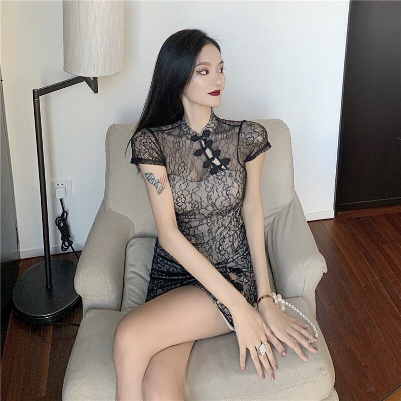 フラワーレースの透け感がエレガントなチャイナドレス風ワンピース。