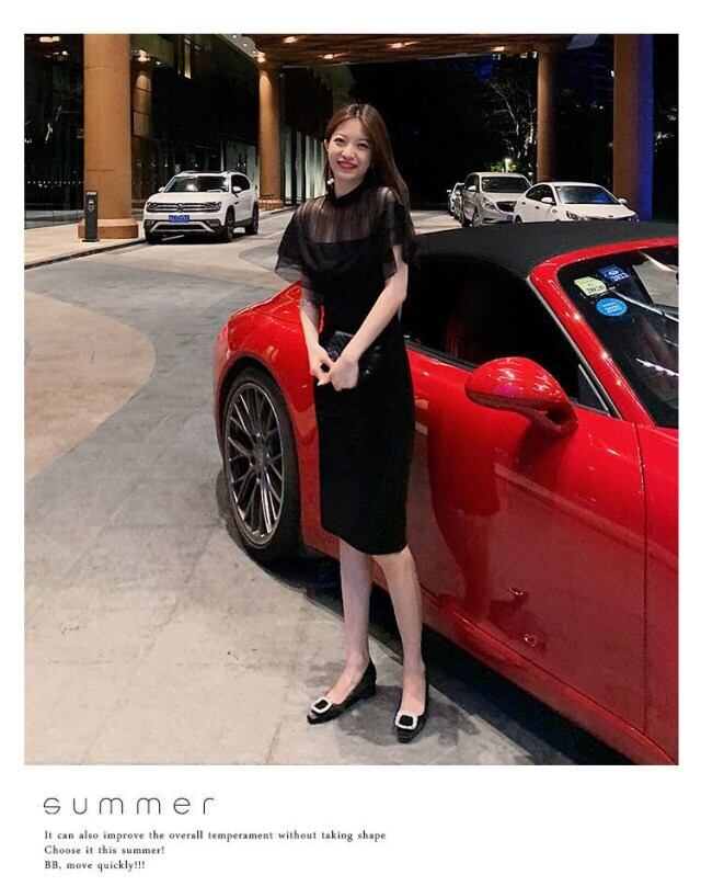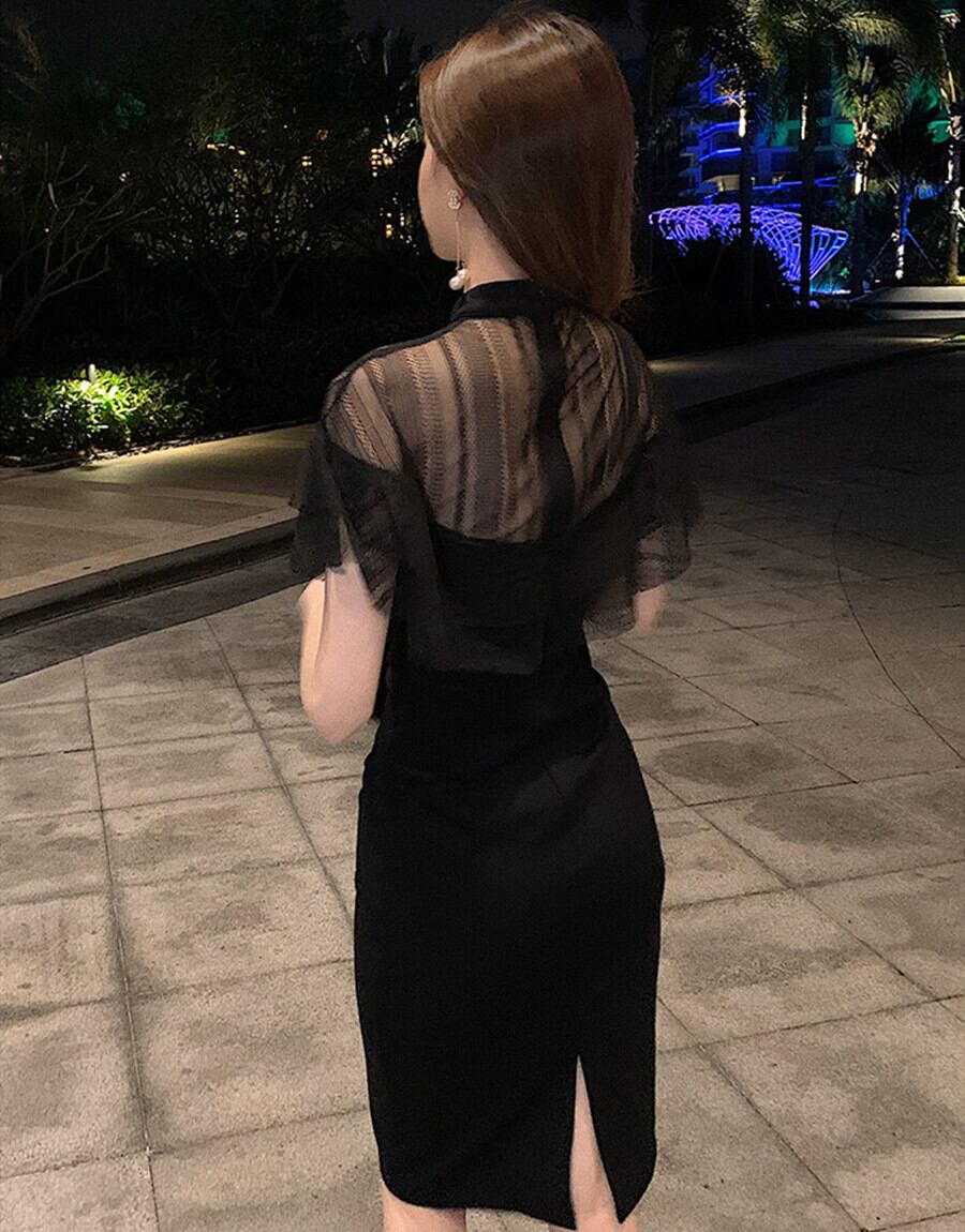 チュールと透け感とボディコンシャスなブラック生地の仕立てが魅力です。