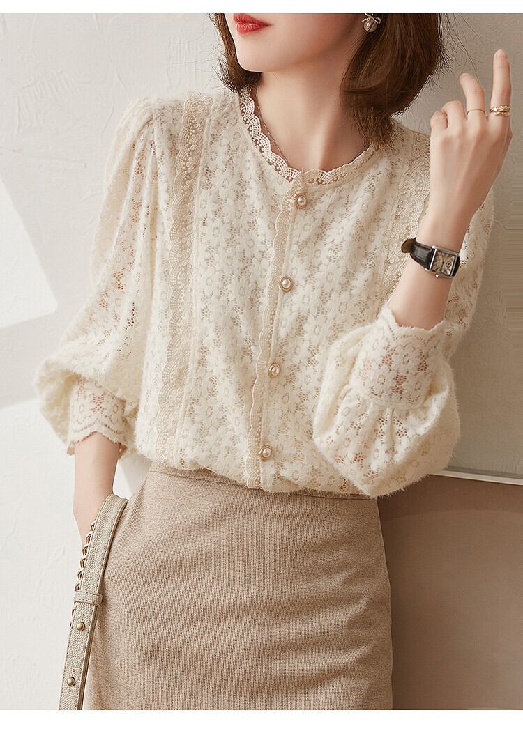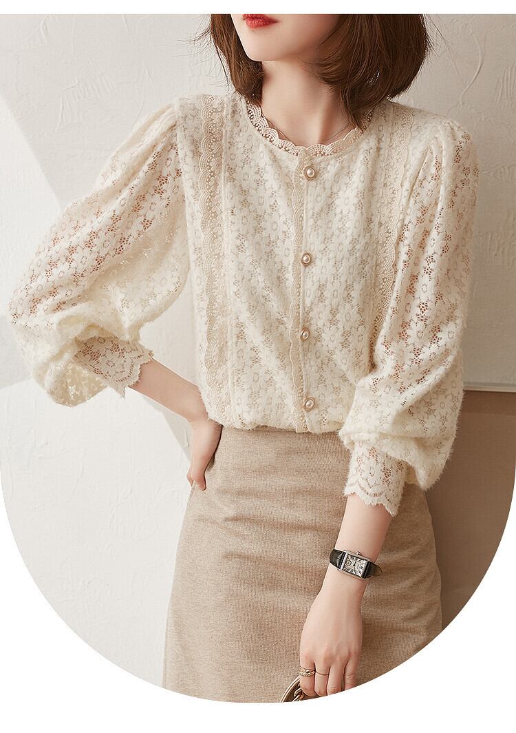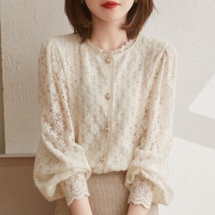 ふっくらとしたパフスリーブと繊細なフラワーレースが優しくフェミニンな印象のカーディガンです。