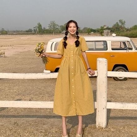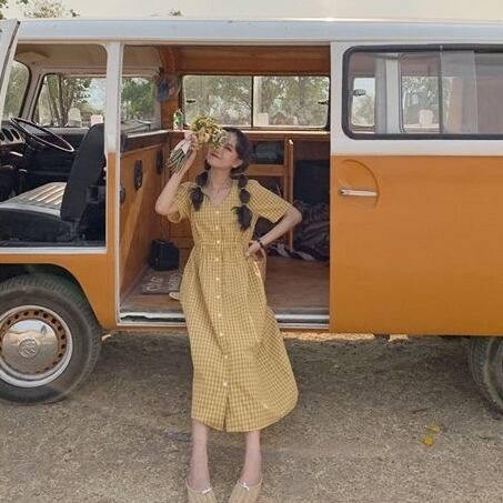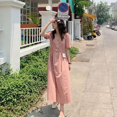 ギンガムチェックとウエストドローストリングがフェミニンな一着です。