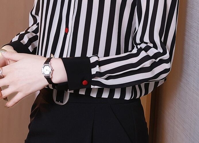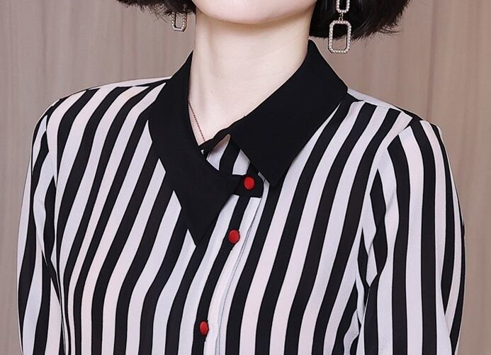 モノトーンのストライプにポイントカラーのレッドボタンがアクセントになったシフォンブラウスです。