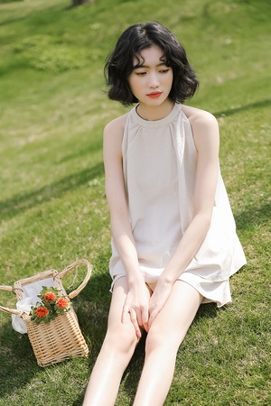 ホルターネックトップスとベーシックなパンツで抜け感を演出。
