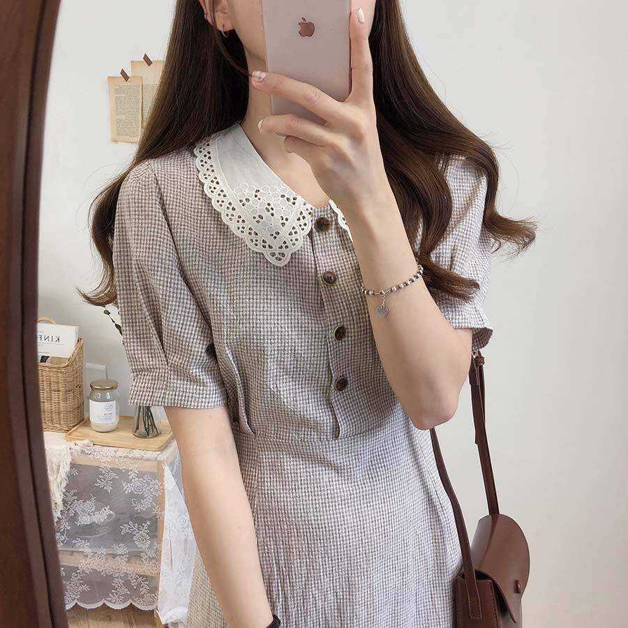 ワンピース レディース 送料無料 フレアワンピース ロング丈 マキシ丈 ミモレ丈 Vネック チェックパフスリーブ ビッグカラ― レース襟 半袖 体系カバー エレガント シンプル 大人可愛い きれいめ お洒落 おしゃれ 大人女子 ワンピドレス イベント デート パーティ― 女子会 休日 お出かけ 韓国 オルチャン ファッション コーデ かわいい 大人可愛い きれいめ シンプル 大人 上品 おしゃれ お呼ばれ 二次会 かわいい モテコーデ ベーシック 大人かわいい インスタ トレンド モテコーデ
