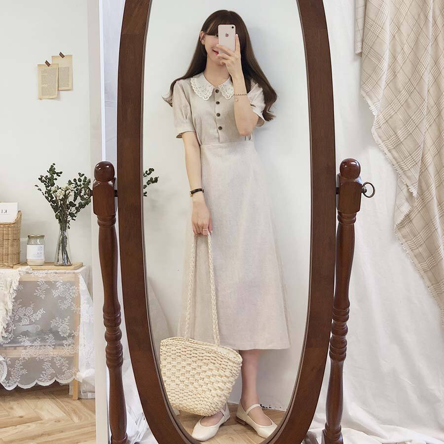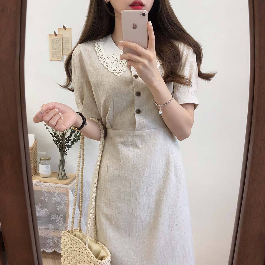 セーラー風の大きな襟にレースをあしらったミディアム丈ワンピース。