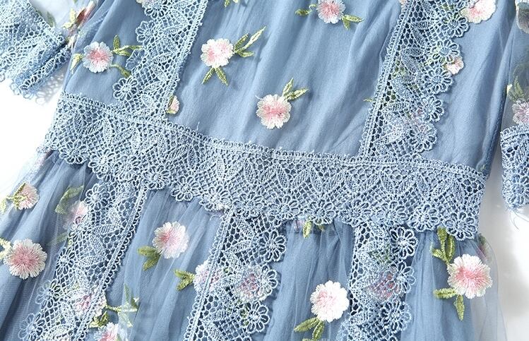 ワンピース レディース 送料無料 フレアワンピース フレア ロングワンピース ロング丈 マキシ丈 マキシワンピース シースルー 総レース 立ち襟 フリルスタンドカラー ティアドロッププラケット イリュージョンネック 半袖 五分袖 5分袖 ハイウエスト ウエストマーク 体型カバー 細見え 脚長 スリム 花柄 フラワー プリント 清楚 清潔感 抜け感 爽やか 涼し 通気性 大人可愛い ガーリー 上品 エレガント お洒落 おしゃれ ラブリー キュート こなれ感 ブルー 10代 20代 30代 春服 夏服 デート