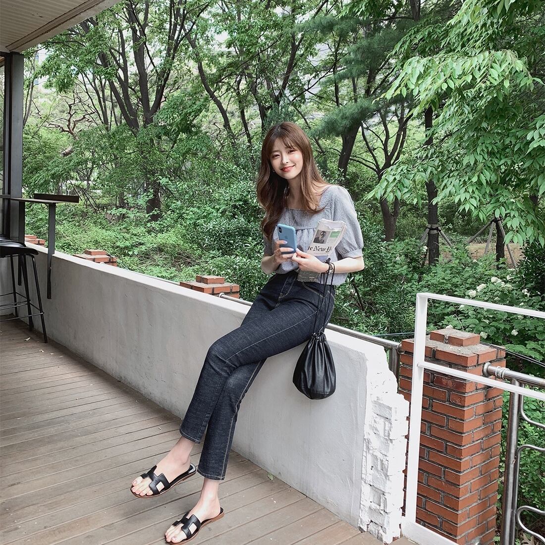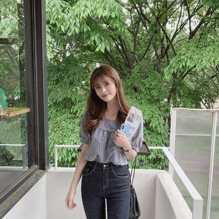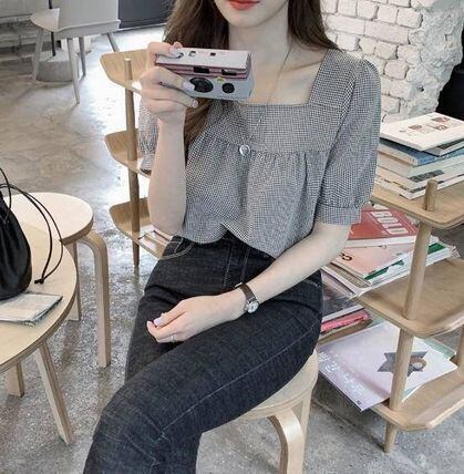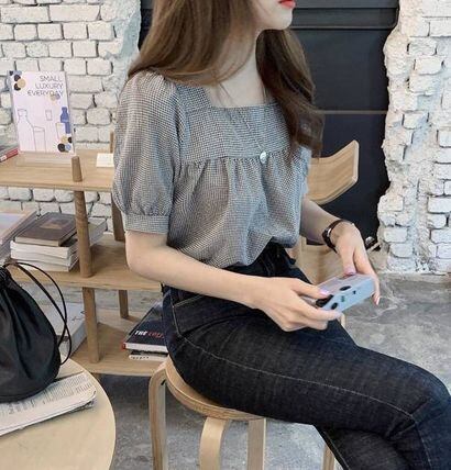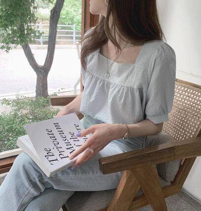 ガーリーなスクエアネックとギンガムチェックのシャツブラウス。