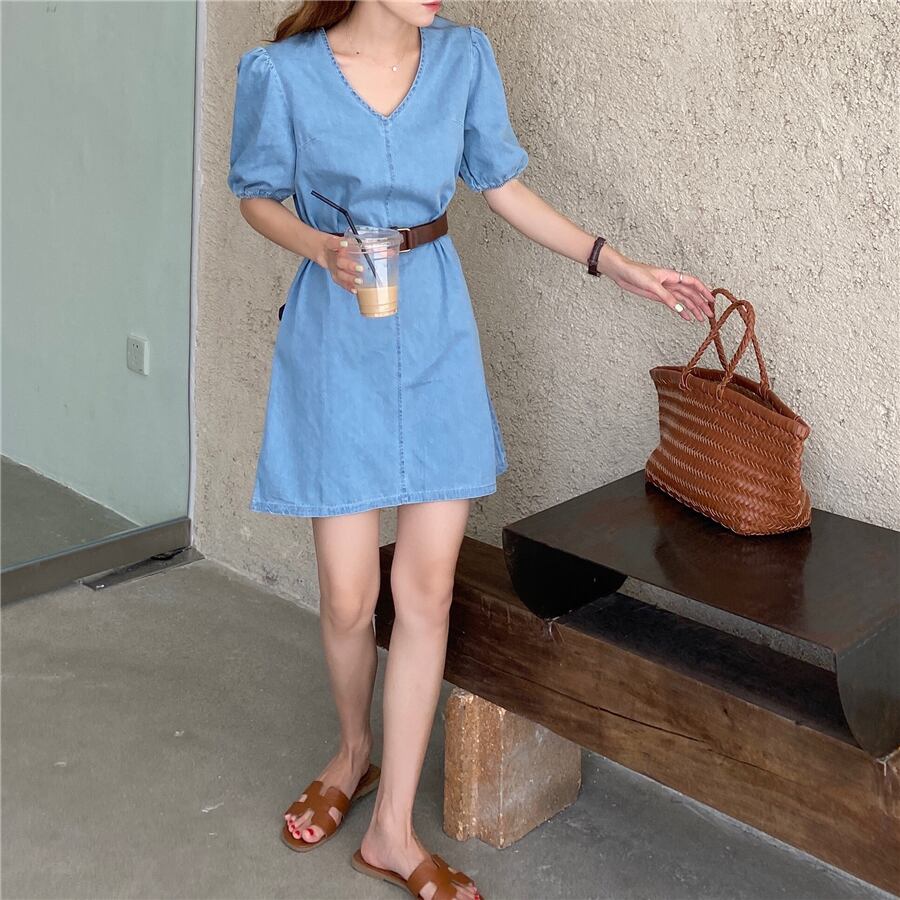 ワンピース レディース 送料無料 フレアワンピース ショート丈 デニム 膝丈 ひざ丈 袖あり セミフレア スリム 細身 Vネック ウエストマーク パフスリーブ 切り替えデザイン Vネック 半袖 かわいい 大人可愛い きれいめ 上品 おしゃれ アジアン エスニック 大人女子 こなれ感 キュート ガーリー エレガント モダン 存在感 緑 グリーン 春 秋 冬 20代 30代 ママ デート お出かけ パーティー イベント リゾート 普段使い 韓国系 オルチャン 体系カバー 脚長 インスタ映え