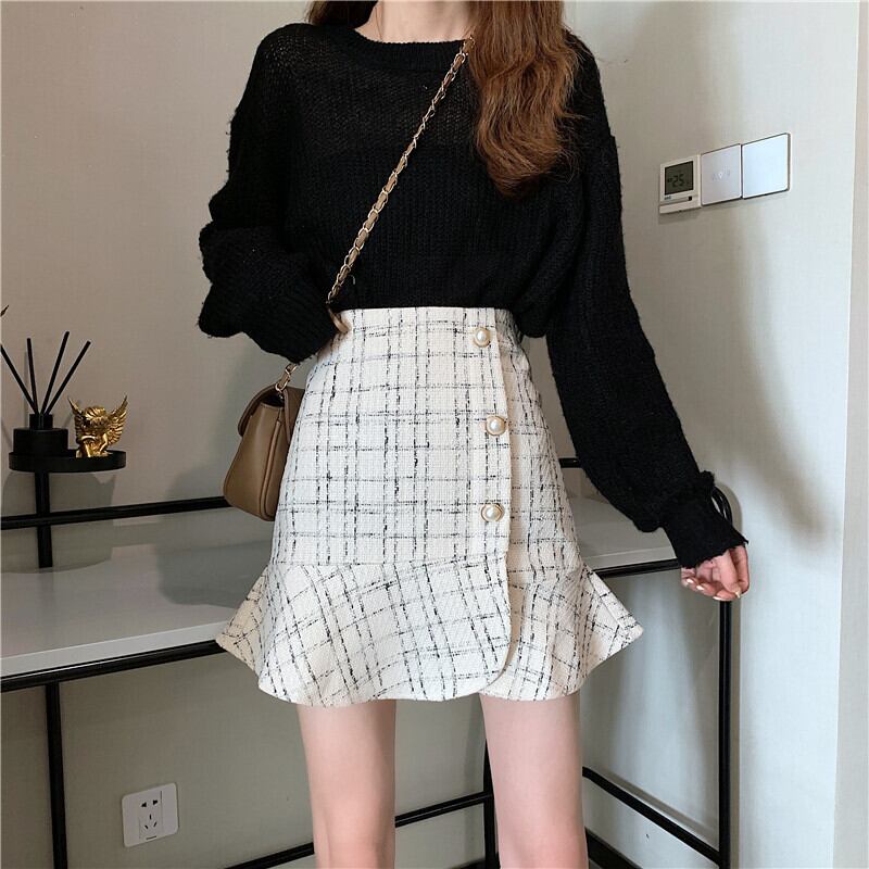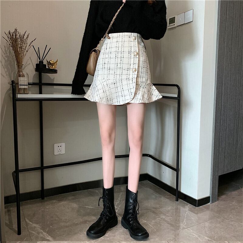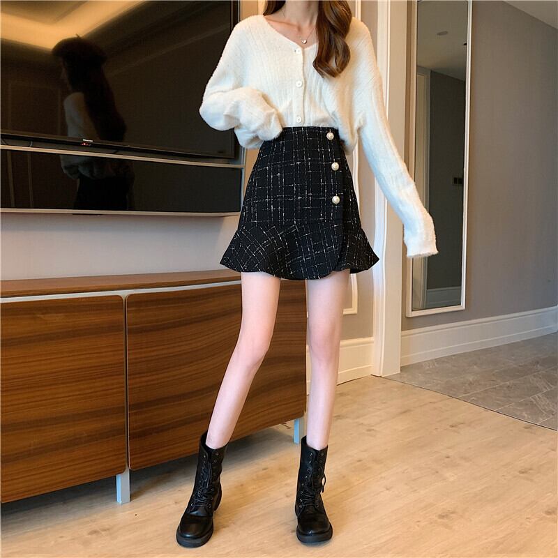 ガーリーなツイードチェックとパールボタンのミニスカート。