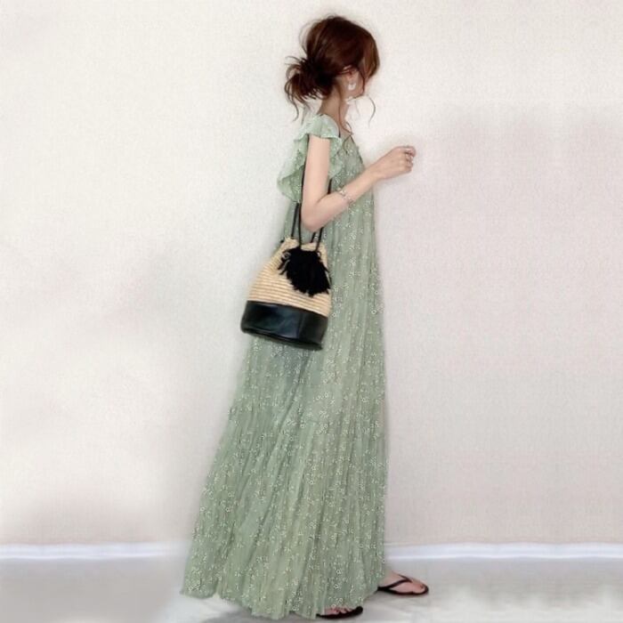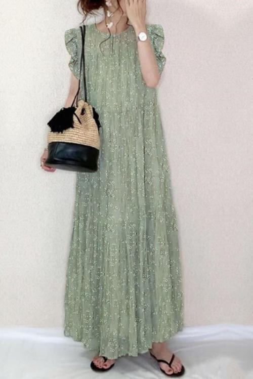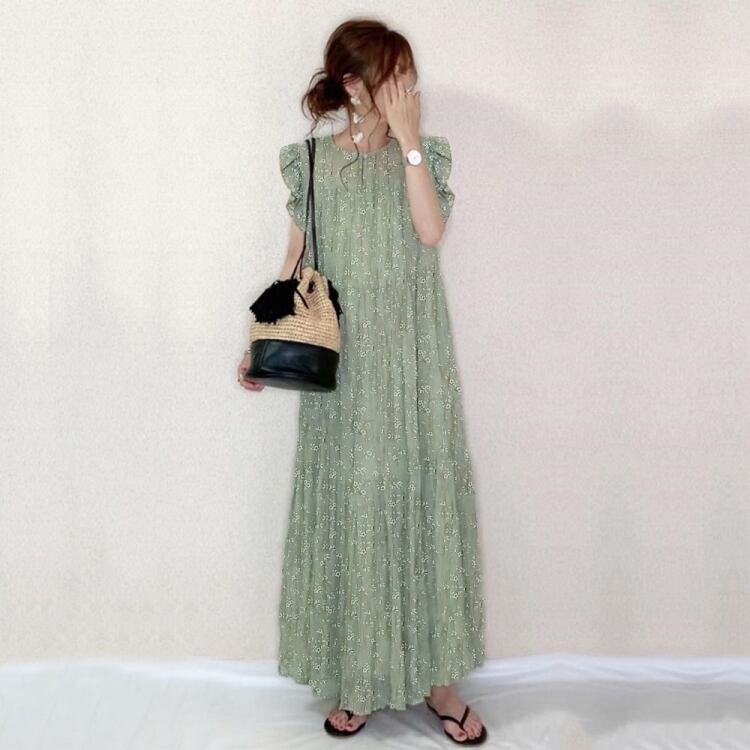 ワンピース ドレス レディース 送料無料 フレアスリーブ ティアードワンピース ロング ミモレ丈 ノースリーブ 透け感 シアー シースルー クルーネック シャーリング シフォン ウエストマーク ハイウエスト ウエストゴム切り替え 大人可愛い シンプル 上品 おしゃれ 大人女子 こなれ感 ラブリー キュート ガーリー エレガント モダン 抜け感 S M L XL 青 ブルー 花柄 小花柄 フラワー ボタニカル 春 夏 秋 10代 20代 30代 デート お出かけ 旅行 海 プール 普段使い 体系カバー
