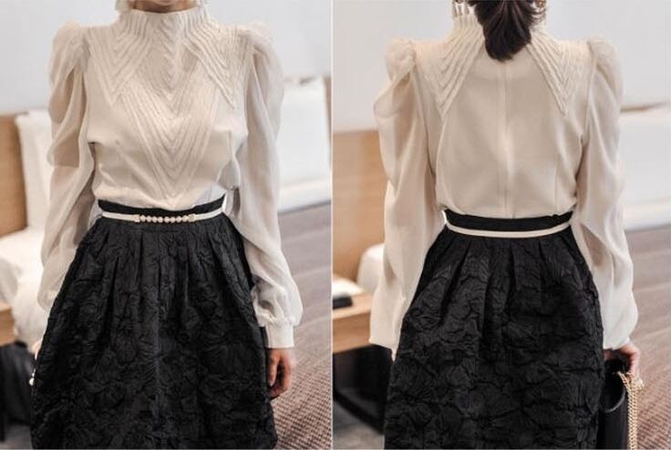 トップス レディース 送料無料 2色展開 ブラウス シャツ 襟付き 立ち襟 スタンドカラー クルーネック 長袖 ロングスリーブ パフスリーブ ワイド ホワイト ブラック 単色 柄物 フェミニン こなれ感 上品 エレガント シンプル カッコイイ かっこいい 清潔感 マニッシュ ボーイッシュ メンズライク おしゃれ お洒落 モダン ガーリー キュート カジュアル 春服 夏服 秋服 冬服 オールシーズン シーズンレス おでかけ デート 普段使い 重ね着 着回し 10代 20代 30代 トレンド 流行 2021
