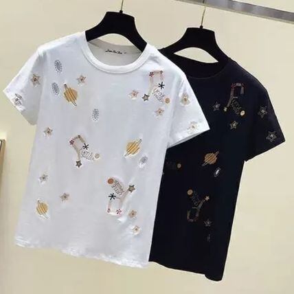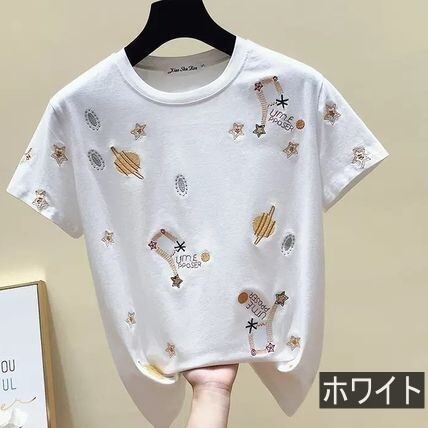トップス レディース 送料無料 2色展開 Tシャツ カットソー 丸首 ラウンドネック 半袖 プルオーバー ワイド ゆったり ゆる 大きめ 楽ちん ホワイト ブラック 宇宙柄 刺繍 こなれ感 上品 エレガント シンプル カッコイイ かっこいい 清潔感 マニッシュ ボーイッシュ メンズライク おしゃれ お洒落 モダン カジュアル ラフ キュート ガーリー ラブリー 春服 夏服 秋服 冬服 オールシーズン シーズンレス おでかけ デート 普段使い 重ね着 着回し 10代 20代 30代 トレンド お揃い 定番