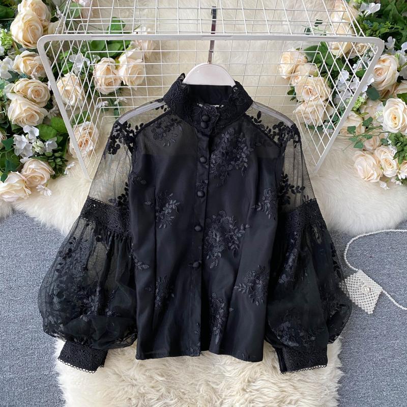 トップス レディース 送料無料 2色展開 ブラウス シャツ 襟付き 立ち襟 フリルスタンドカラー クルーネック 長袖 ロングスリーブ バルーンスリーブ バブルスリーブ 前開き フロントボタン ワイド ホワイト ブラック 花柄 刺繍 チュール シースルー 透け感 シアー ガーリー キュート フェミニン こなれ感 上品 エレガント 清潔感 おしゃれ お洒落 モダン 春服 夏服 秋服 冬服 オールシーズン シーズンレス おでかけ デート 10代 20代 トレンド 流行 インスタ映え 韓国 オルチャン 2021
