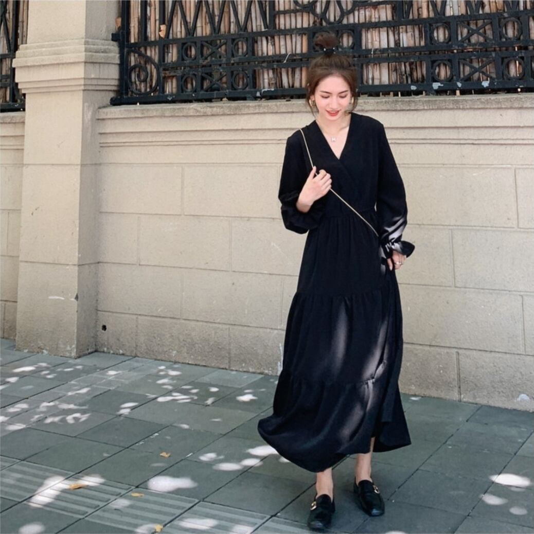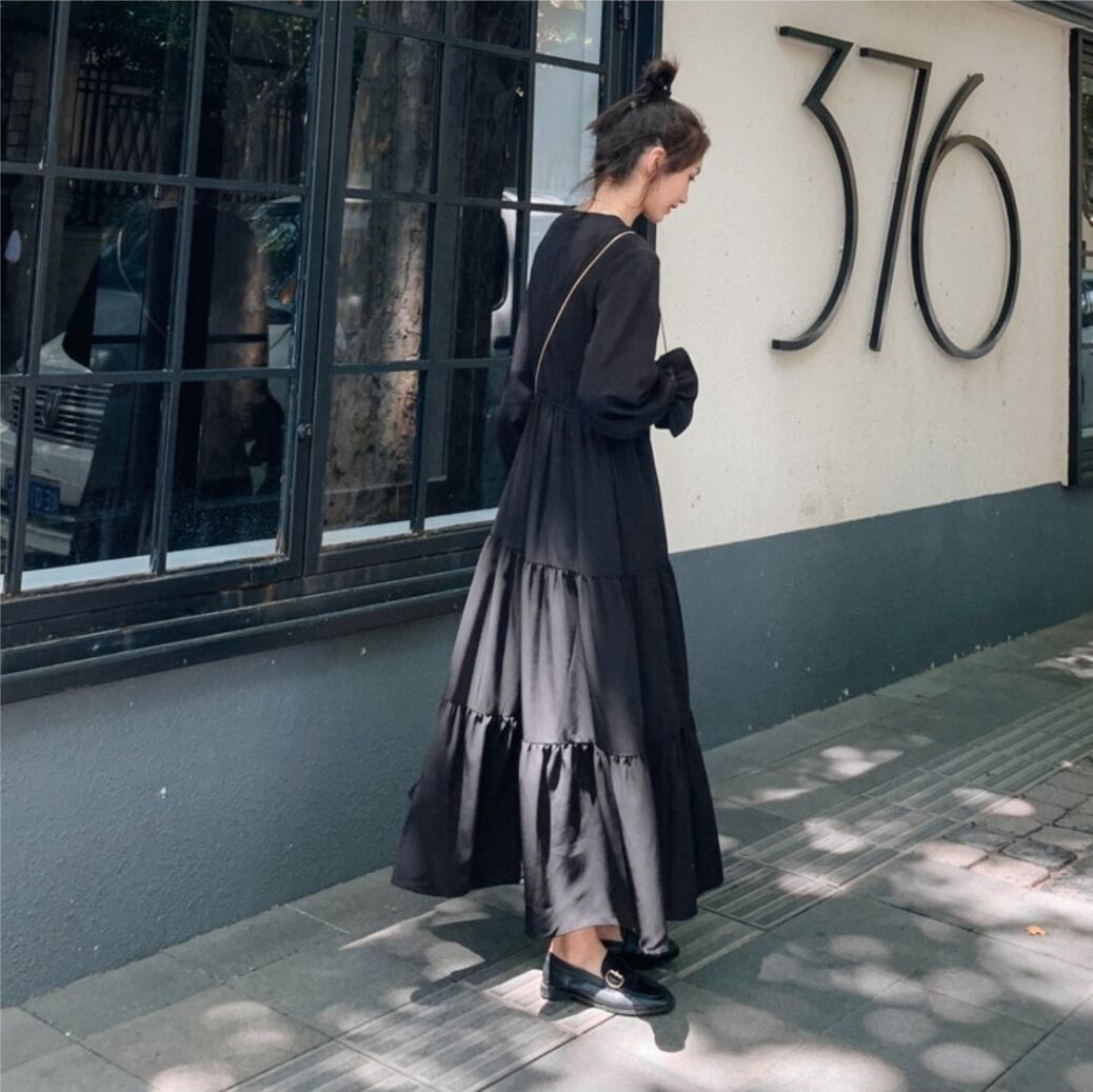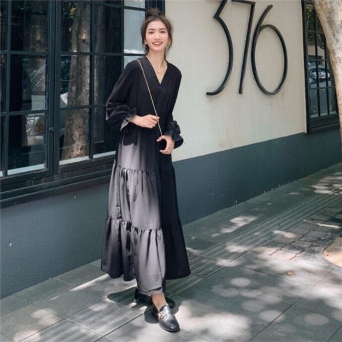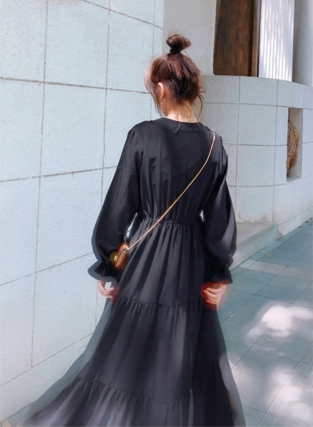 ワンピース レディース 送料無料 フレアワンピース ティアードワンピース ロングワンピース マキシワンピース Vネック 長袖 サーキュラーカフス プルオーバー ハイウエスト 体型カバー 細見え 着痩せ 脚長 スリム スタイルアップ ブラック 無地 ロング丈 マキシ丈 フェミニン ワイド ゆったり ゆる 大きめ 楽ちん 爽やか 涼し 清潔感 清楚 抜け感 通気性 大人可愛い 大人女子 おしゃれ お洒落 上品 エレガント ラフ モダン カジュアル ガーリー ラブリー キュート 春服 夏服 普段使い おでかけ