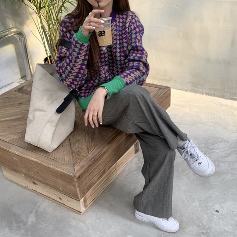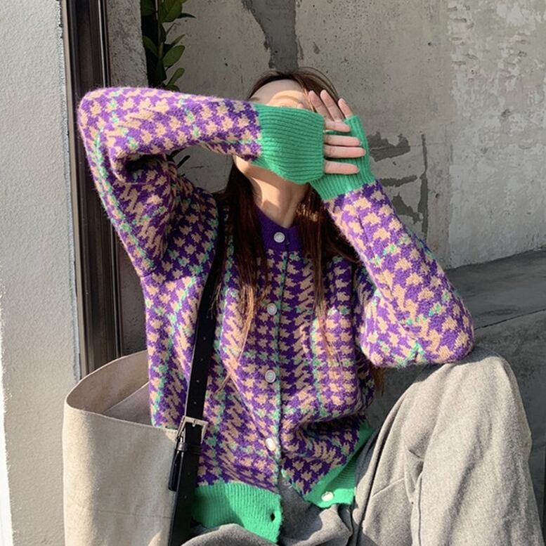 カラフルな千鳥模様が目を惹くレトロなカーディガン
