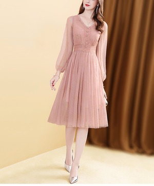 デコルテ周りのレースやボタン遣いが繊細な一着です。