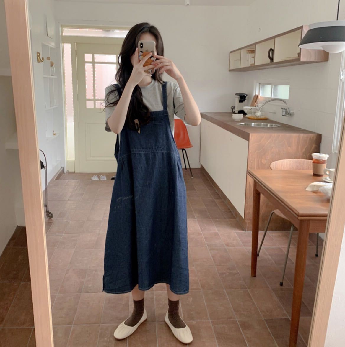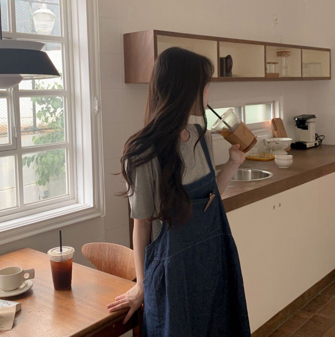 インディゴの落ち着いたジャンパースカートとグレーTシャツのセット。