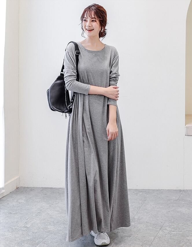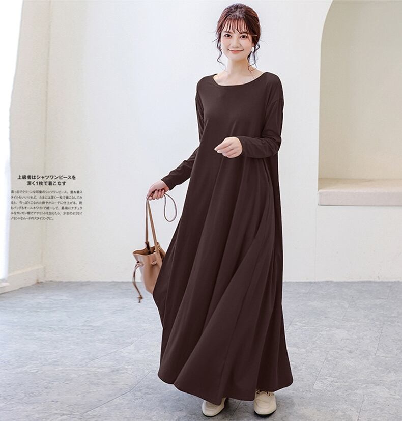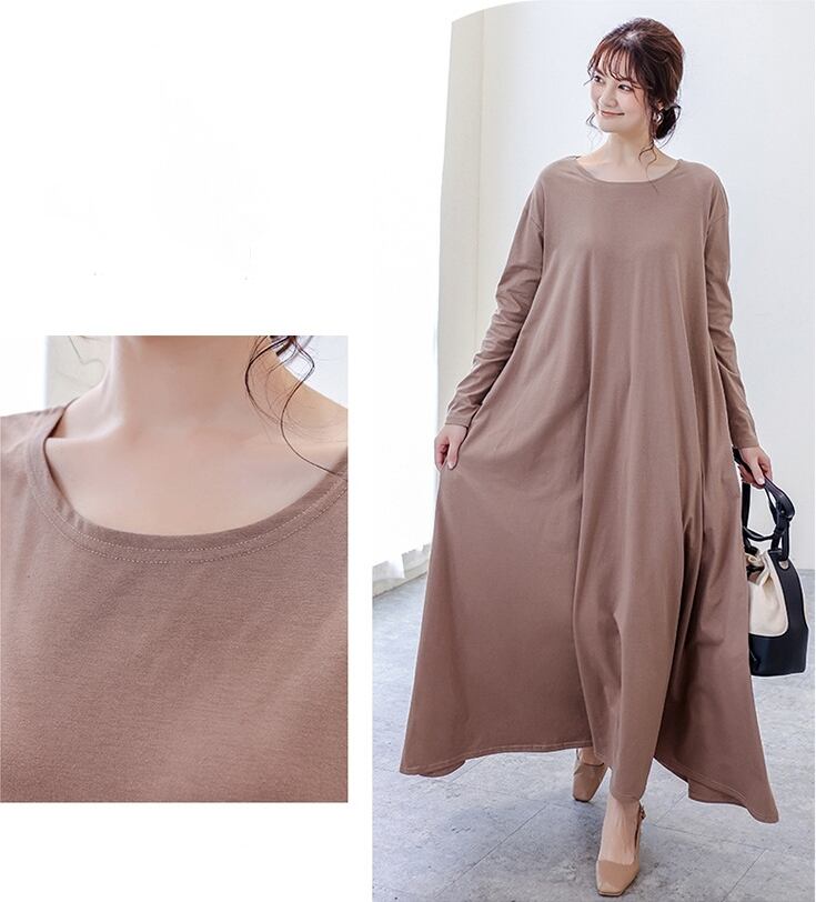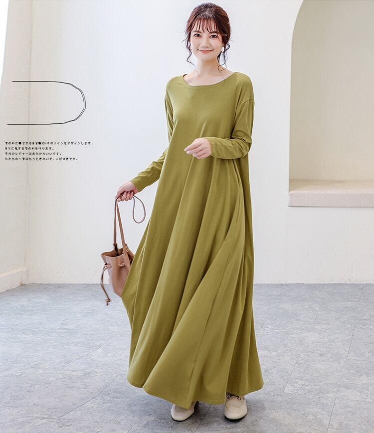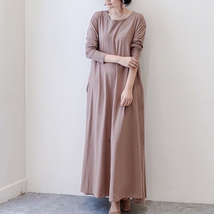 ワンピース レディース 送料無料 フレアワンピース Tシャツワンピース ロング丈 マキシ丈 丸首 ラウンドネック 長袖 ロングスリーブ プルオーバー サイドポケット ポケット付き 体型カバー ワイド ゆったり ゆる 大きめ Aライン カーキ ブラック グリーン ブラウン ブルー ネイビー グレー 無地 カジュアル ラフ 大人女子 こなれ感 おしゃれ お洒落 フェミニン 大人可愛い 上品 エレガント 動きやすい 清潔感 楽ちん 通気性 春服 秋服 おでかけ デート 普段使い 着回し 重ね着 新作 2021