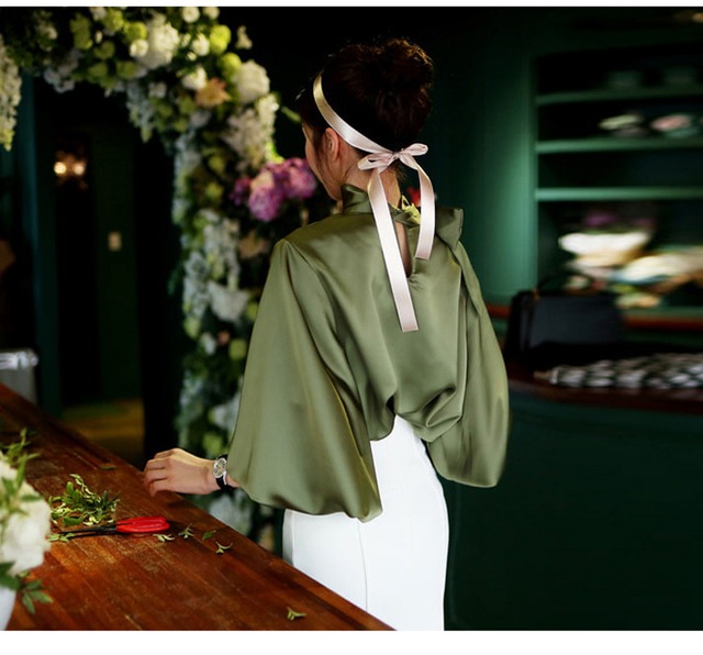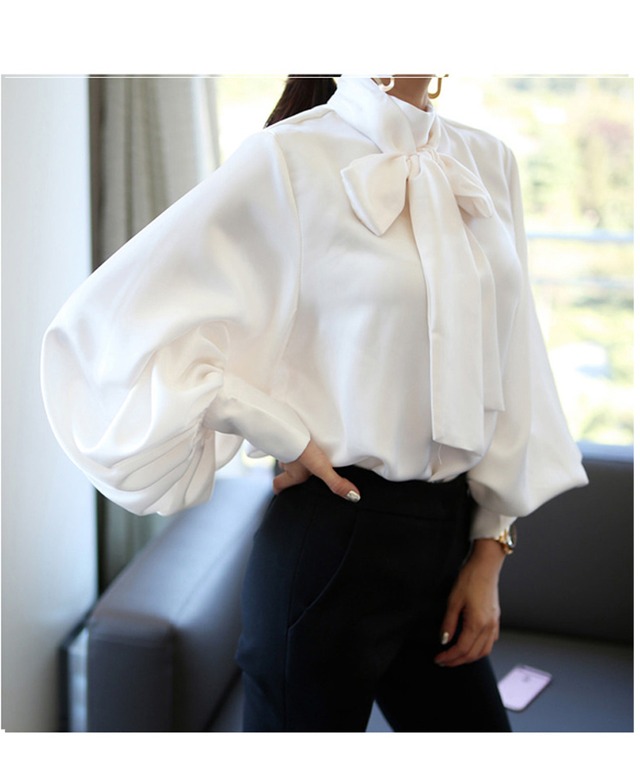 トップス レディース 送料無料 ブラウス シャツ クルーネック ボウタイ リボン 長袖 パフスリーブ バルーンスリーブ ボリューム袖 バブルスリーブ ロングカフス 体型カバー 二の腕カバー 華奢見え 細見え ワイド ゆったり ゆる 大きめ ホワイト グリーン 無地 単色 光沢感 サテン 大人女子 抜け感 こなれ感 おしゃれ お洒落 ガーリー フェミニン かわいい 可愛い ラブリー キュート 爽やか 涼し 清潔感 楽ちん 存在感 薄手 春服 夏服 おでかけ デート 普段使い 着回し 重ね着 新作 2021