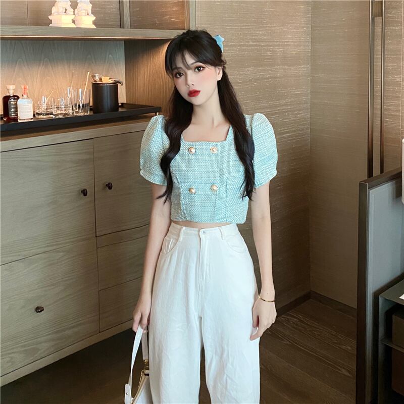 レディース トップス ブラウス ダブルボタン パフスリーブ ショート ショート丈袖あり 半袖 かわいい 大人可愛い 大人 上品 おしゃれ お洒落 大人可愛い 大人女子 ラブリー キュート ガーリー エレガント モダン 主役級 存在感 緑 グリーン 春 夏 秋 入学式 入園式 卒業式 卒園式 謝恩会 結婚式 二次会 披露宴 30代 40代 オフィス ビジネス OL 通勤 学生 通学 デート お出かけ 着回し 普段使い 韓国 韓国系 オルチャン ファッション