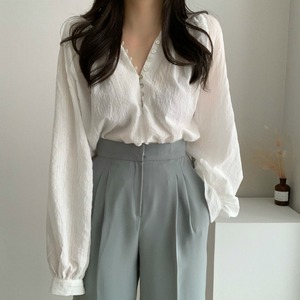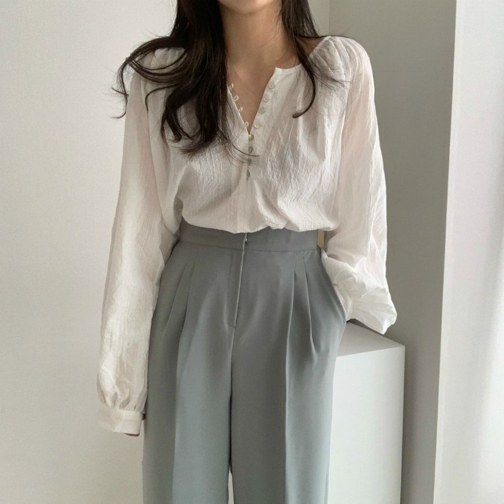 連なったボタンの仕立てがシックなニュアンス生地のブラウスです。
