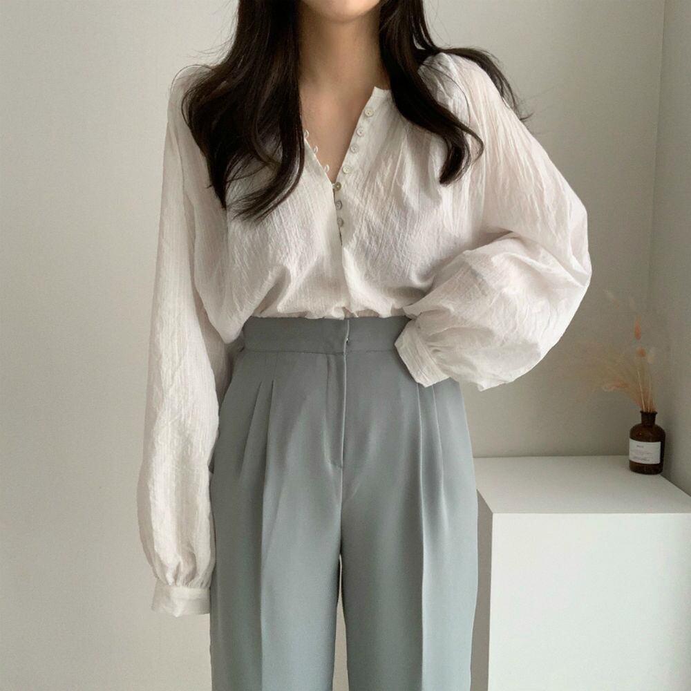 トップス レディース 送料無料 2色 ブラウス シャツ シフォンシャツ クルーネック 長袖 シェルボタン ロングスリーブ パフスリーブ バルーンスリーブ ボリューム袖 体型カバー 細見え 華奢見え 二の腕カバー 無地 清楚 清潔感 抜け感 爽やか 大人可愛い ガーリー 上品 エレガント お洒落 おしゃれ ラブリー キュート こなれ感 シンプル カジュアル モダン ホワイト 10代 20代 春服 夏服 秋服 冬服 オールシーズン シーズンレス 学生 通学 デート おでかけ 普段使い 着回し 重ね着 新作