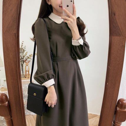 襟と袖がレイヤードしたようなフェミニンなミモレ丈シャツワンピース。