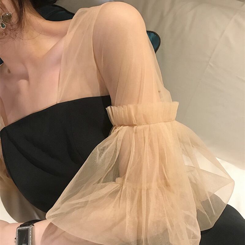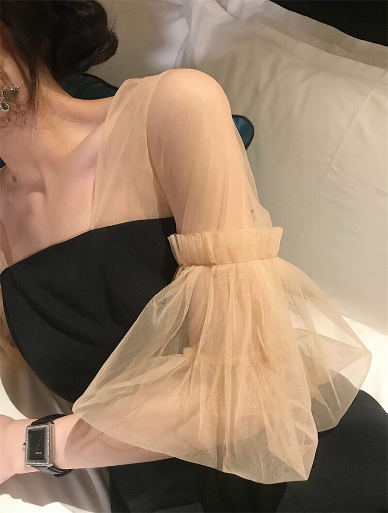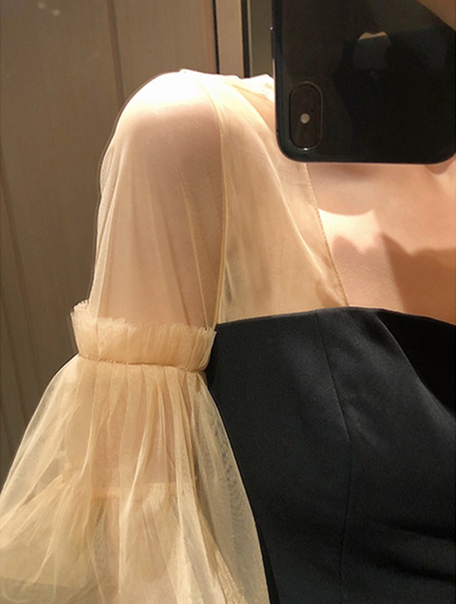 チュール素材のデコルテ切り替えががキュートなワンピース。