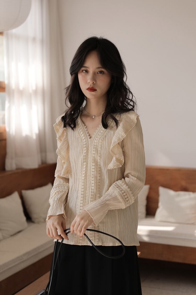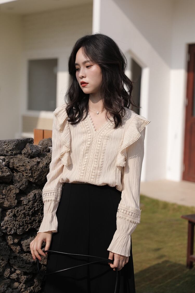 トップス レディース 送料無料 2色展開 ブラウス シャツ Vネック レース フリル 長袖 パフスリーブ プルオーバー 体型カバー 二の腕カバー 脚長 細見え 華奢見え ホワイト アプリコット 大人女子 抜け感 こなれ感 おしゃれ お洒落 フェミニン ガーリー キュート 大人可愛い 上品 エレガント かわいい 動きやすい 爽やか 涼し 清潔感 楽ちん 存在感 鮮やか 華やか 通気性 春服 夏服 秋服 冬服 オールシーズン シーズンレス おでかけ デート 普段使い 着回し 重ね着 流行 新作 2021