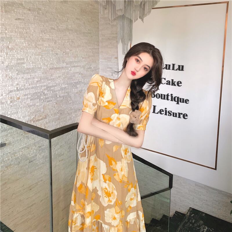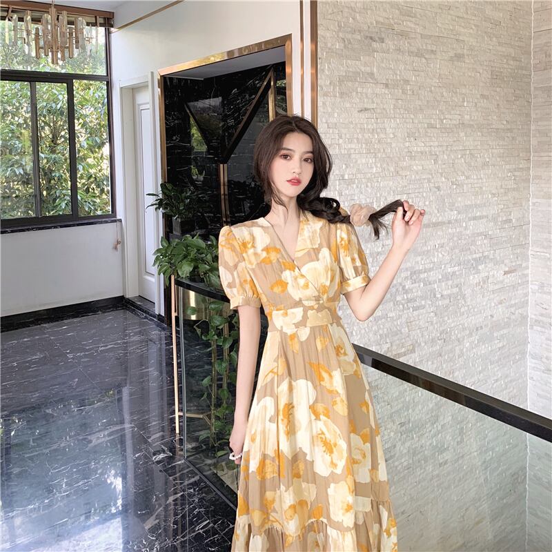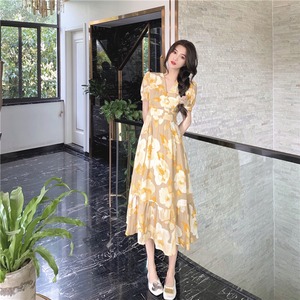 ワンピース レディース 送料無料 2色 カシュクールワンピース フラワープリントワンピース フレアワンピース 半袖 パフスリーブ ハイウエスト ミモレ丈 Vネック リラックス イエロー グリーン おしゃれ ロマンチック ガーリー キュート かわいい こなれ感 スタイル 小顔見せ 着痩せ 体形カバー インスタ トレンド きれいめ エレガント ギャザー シャーリング フレア 大人かわいい 上品 リゾート 旅行 シフォン ドール お人形 ふんわり パフスリーブ デート お出かけ カジュアルドレス