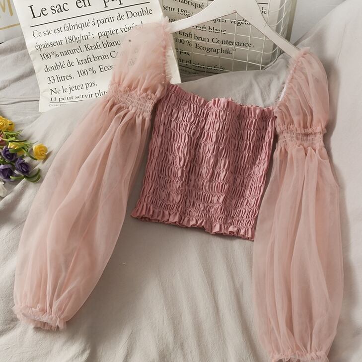 シャツ レディース スニッチウェア 送料無料 5色 シャーリング クロップトップ シフォン スクエアネック フリル チュール メッシュ ドット 長袖 フレア 襟なしレース シフォン ボタン パフスリーブ パワーショルダー 大人可愛い きれいめ フェミニン おしゃれ お洒落 上品 エレガント 大人女子 こなれ感 抜け感 春 春服 夏 夏服 普段使い モテ 美脚 デート お出かけ 女子会 20代 30代 ファッション スタイル モード