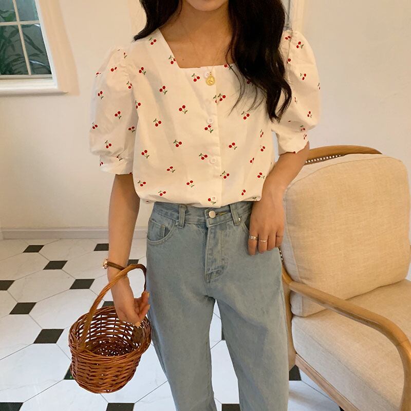 小さなチェリーがいっぱいのふんわりパフスリーブブラウスです。