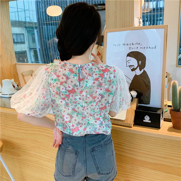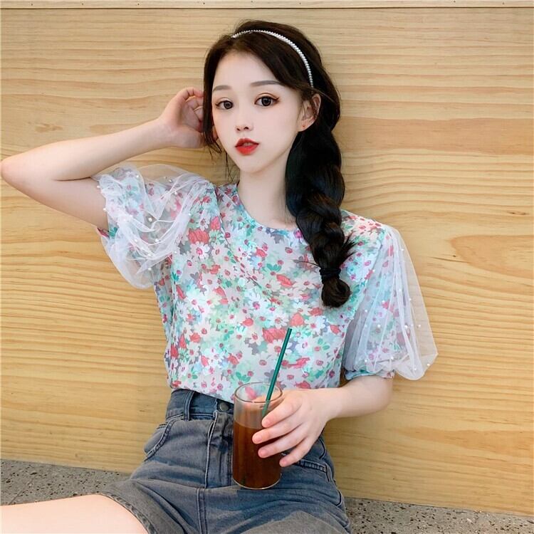 パールがちりばめられたチュールのパフスリーブとフラワープリントがガーリーなブラウスです♡