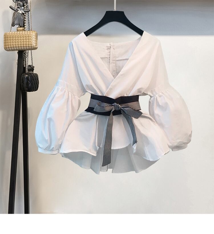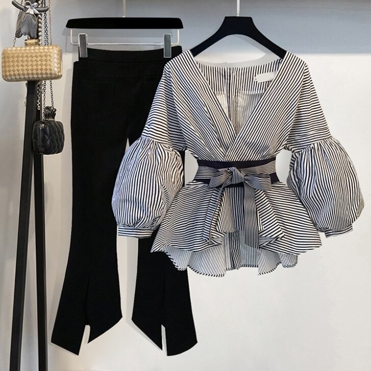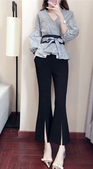 セットアップ 2色 Vネック ストライプ ハイウエスト リボン トップス パンツ ブラウス ワイドパンツ 袖あり 長袖 ボリューム袖 襟なし 白 ホワイト ネイビー 黒 ブラック 無地 春 夏 秋 10代 20代 30代 40代 レディース オフィス ビジネス OL 通勤 学生 通学 デート お出かけ 着回し 普段使い 重ね着 韓国 韓国系 オルチャン ファッション コーデ スタイル モテ 美脚 脚長