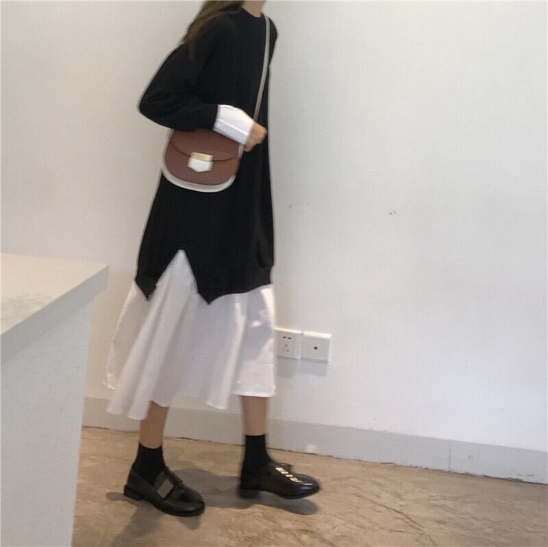 シャツワンピース 長袖 フレア ロング丈 重ね着風 カジュアル ミモレ丈 白シャツ 切り替えデザイン ドッキング かわいい 大人可愛い シンプル カジュアル おしゃれ お洒落 大人可愛い 大人女子 こなれ感 ラフ クール モード系 エレガント モダン 抜け感 白 ホワイト 黒 ブラック 無地 春 秋 冬 10代 20代 30代 40代 50代 レディース 学生 通学 デート お出かけ 公園デビュー 休日 着回し 普段使い 重ね着 韓国 韓国系 オルチャン ファッション コーデ モテ トレンド 流行