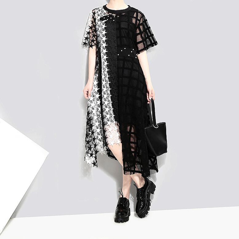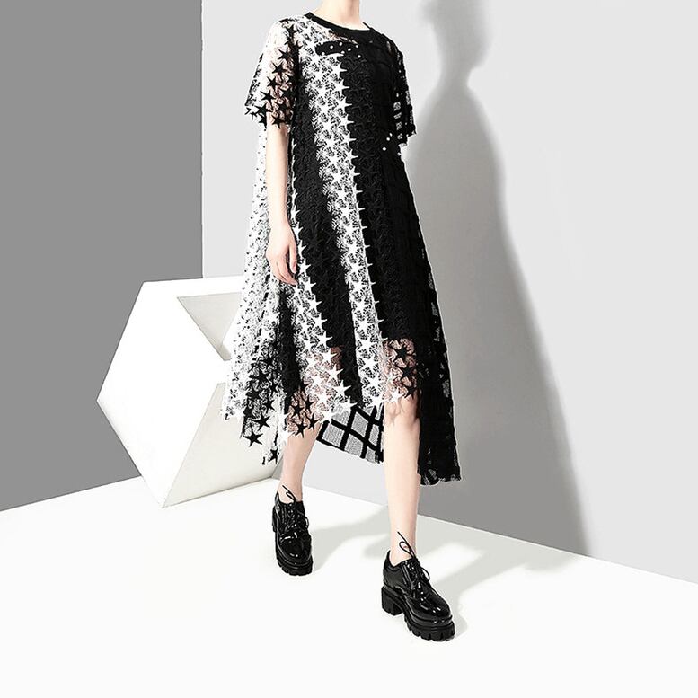 デザインワンピース レディース 送料無料 レース切替ドレス ワンピース ドレス メッシュレース切り替えアシンメトリーTシャツワンピース ドッキングレース星柄MIX半袖シャツイレヘムワンピース シャツワンピース ひざ丈 ミディアム丈 半袖 クルーネック アシンメトリー 切り替えデザイン ドッキング レース 透け感 異素材MIX 大人可愛い きれいめ ゴージャス レトロ キュート ガーリー クール モード系 白 ホワイト 黒 ブラック インスタ映え 春夏 秋冬 大人 おしゃれ デイリー パーティー 二次会