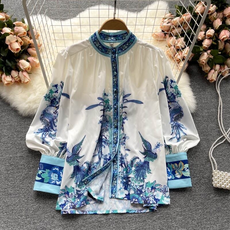 トップス レディース 送料無料 ブラウス シャツ 柄シャツ クルーネック 立ち襟 スタンドカラー 長袖 パフスリーブ ボリューミー バルーンスリーブ 前開き フロントボタン 体型カバー 細見え 二の腕カバー ワイド ゆったり ゆる 大きめ ブルー ホワイト 花柄 フラワー 大人女子 抜け感 こなれ感 おしゃれ お洒落 ガーリー フェミニン かわいい 可愛い ラブリー キュート 爽やか 清潔感 楽ちん シンプル カジュアル 上品 エレガント 春服 夏服 おでかけ デート 普段使い 着回し 重ね着 2021