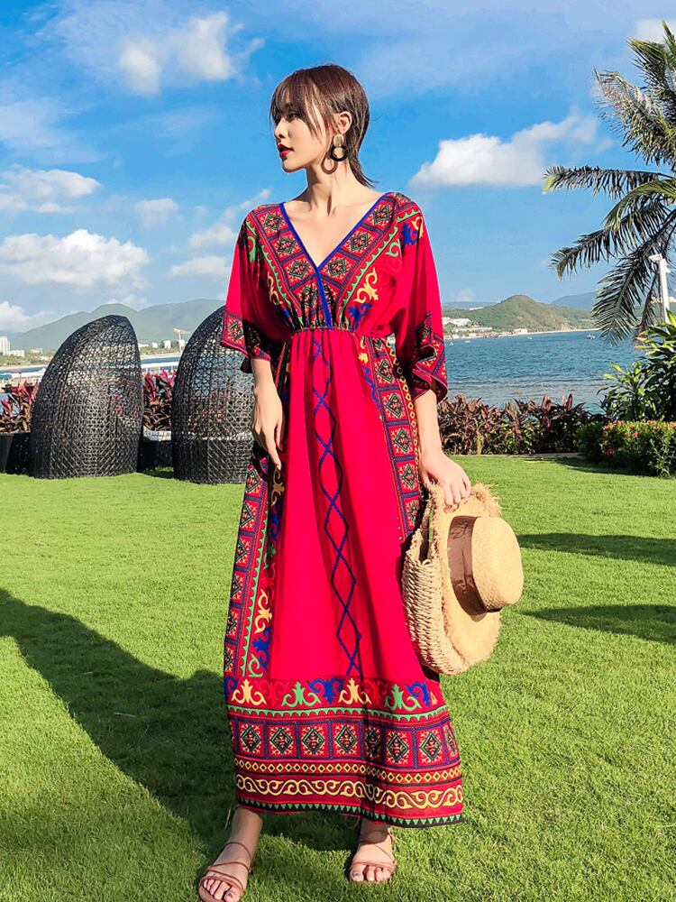 ワンピース レディース 送料無料 3色 エスニックワンピース ボヘミアンワンピース マキシワンピース おしゃれ 民族調 ブルー レッド マルチカラー ナチュラル ラフ リゾート エレガント スタイル 小顔見せ 着痩せ 体形カバー Vネック フレアスリーブ インスタ トレンド きれいめ フェミニン 大人かわいい ギャザー シャーリング マキシ丈 デコルテ 旅行 デート お出かけ ナチュラル ハイウエスト ゆったり オーバーサイズ ゆる リラックス ガーリー キュート 個性的