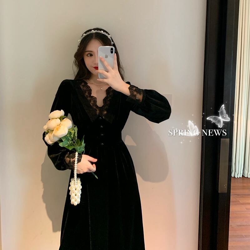 ベロア質感の生地で仕立てたAラインワンピース。