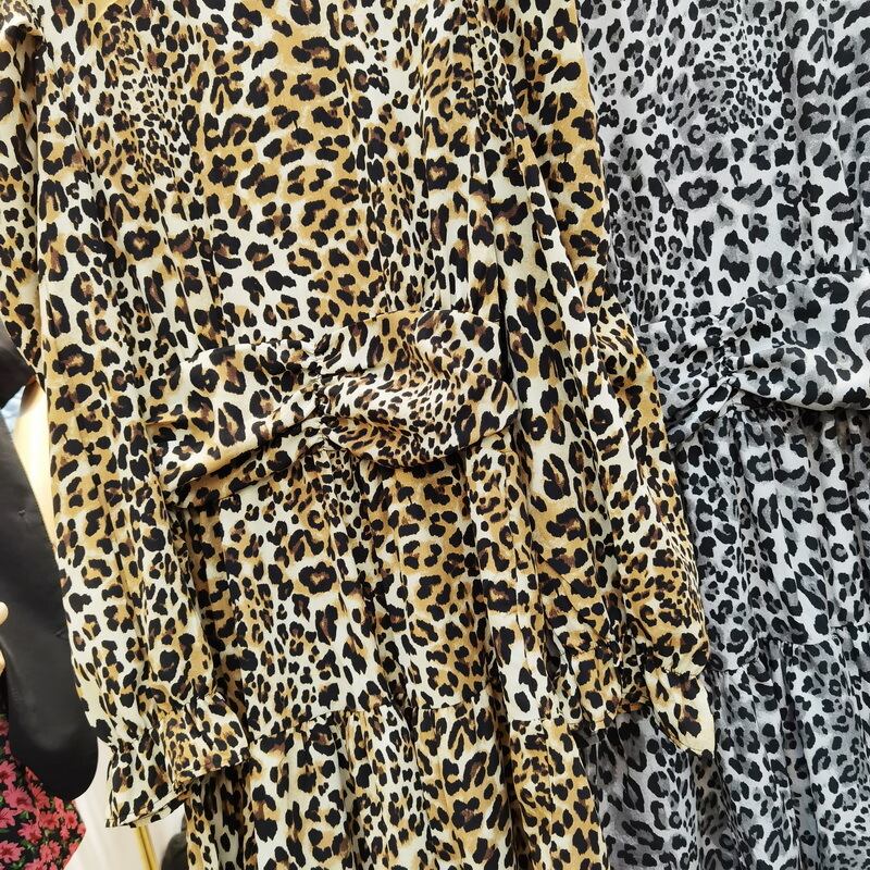 プリーツ入りのレオパードがクラシカルなシフォンワンピース。