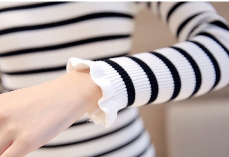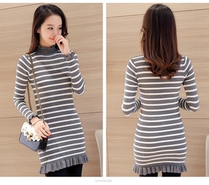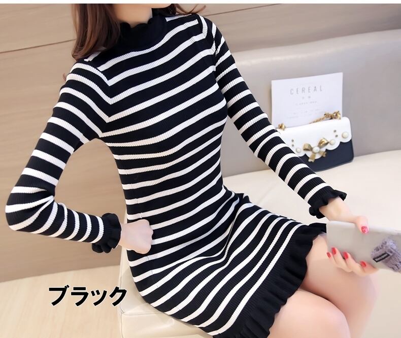 ワンピース レディース 送料無料 3色展開 ニットワンピース フリル襟 ハイネック シースライン Aライン ボディコンシャス ラウンドネック プルオーバー 長袖 ハイウエスト 体型カバー 脚長 細見え スタイルアップ ミディ丈 ミディアム丈 ブラック ブルー ストライプ柄 ボーダー 縞模様 フェミニン きれいめ 上品 エレガント 大人女子 大人可愛い おしゃれ お洒落 シック モダン スタイリッシュ こなれ感 カジュアル 春服 秋服 おでかけ デート 普段使い 重ね着 着回し 20代 30代